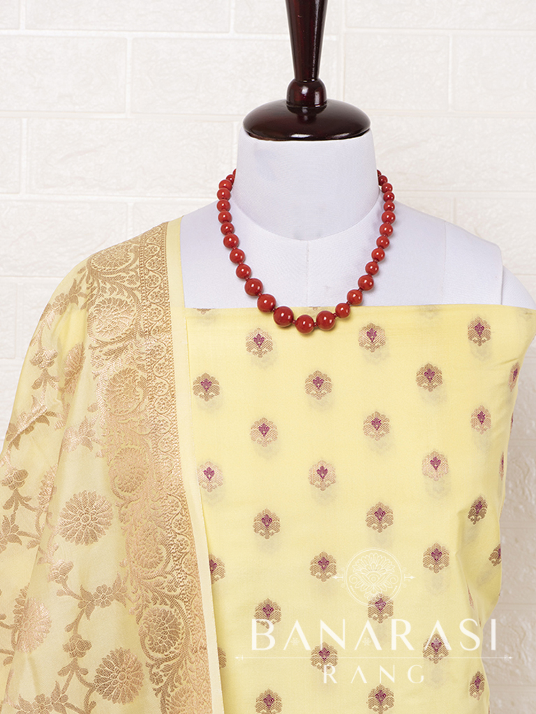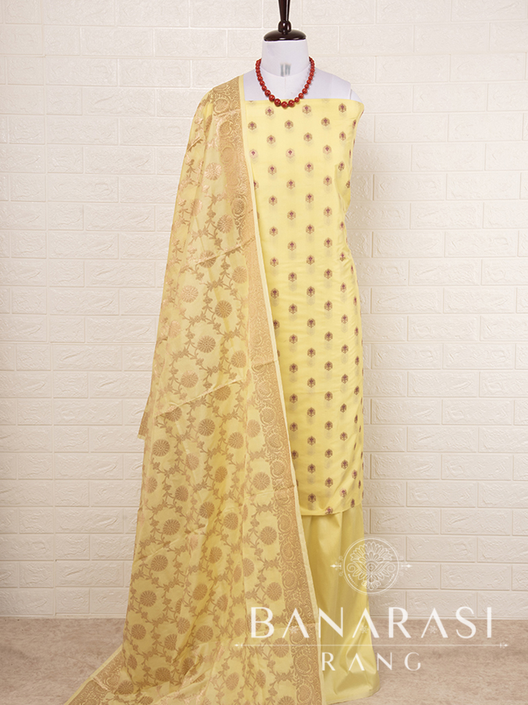 Look dashing in this feminine traditional handwoven exclusive dress material . Includes unstitched fabric of top and bottom,with dupatta. Product - Art Silk