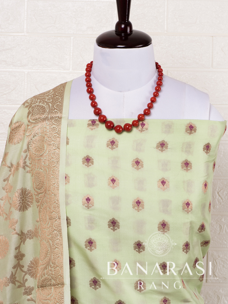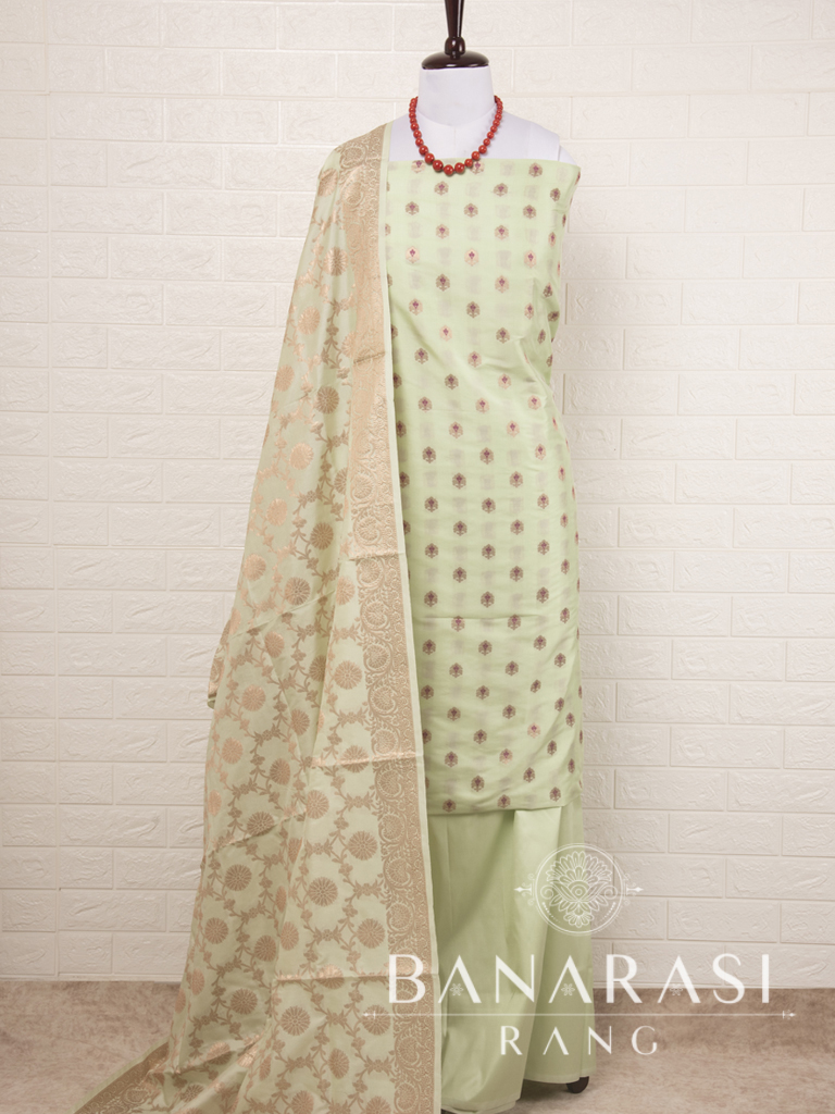 Look dashing in this feminine traditional handwoven exclusive dress material . Includes unstitched fabric of top and bottom,with dupatta. Product - Art Silk