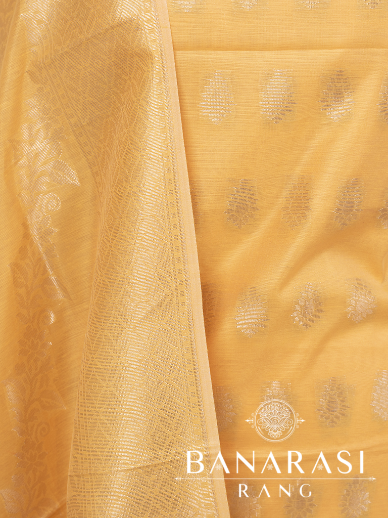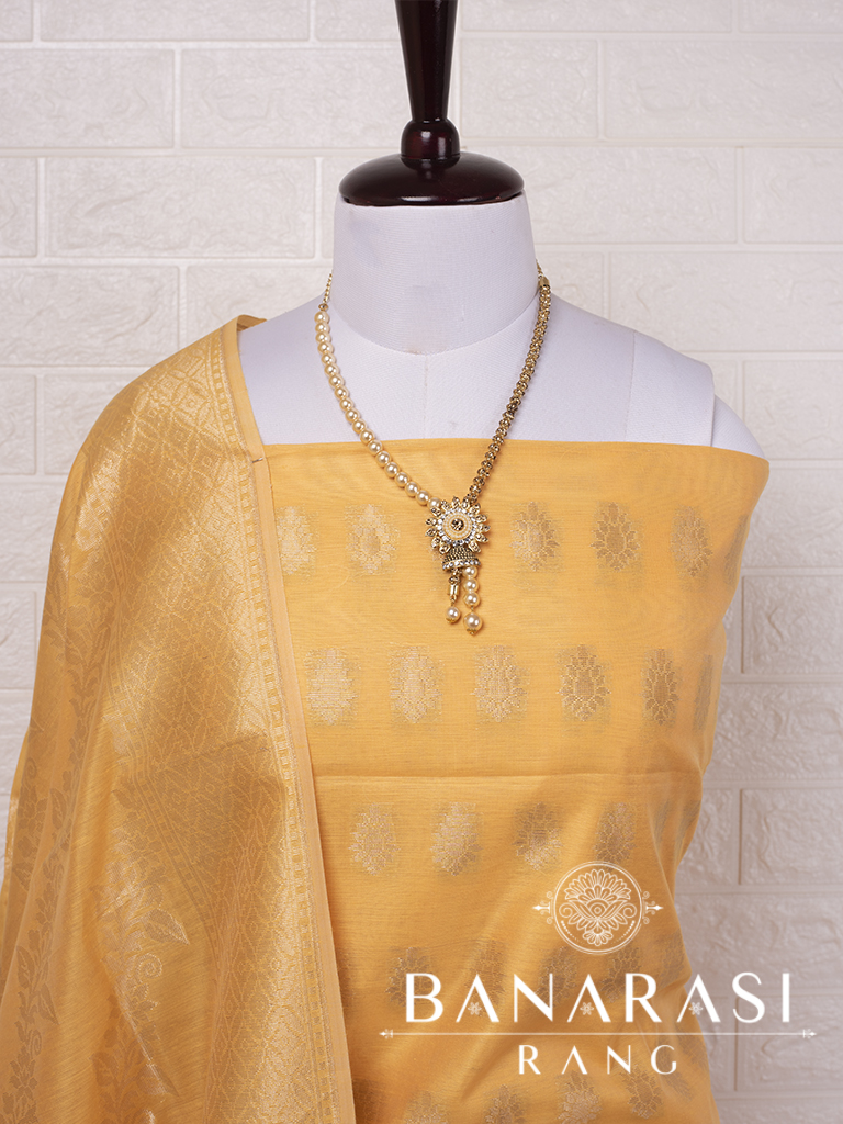 Look dashing in this feminine traditional handwoven exclusive dress material . Includes unstitched fabric of top and bottom,with dupatta. Product - Art Silk