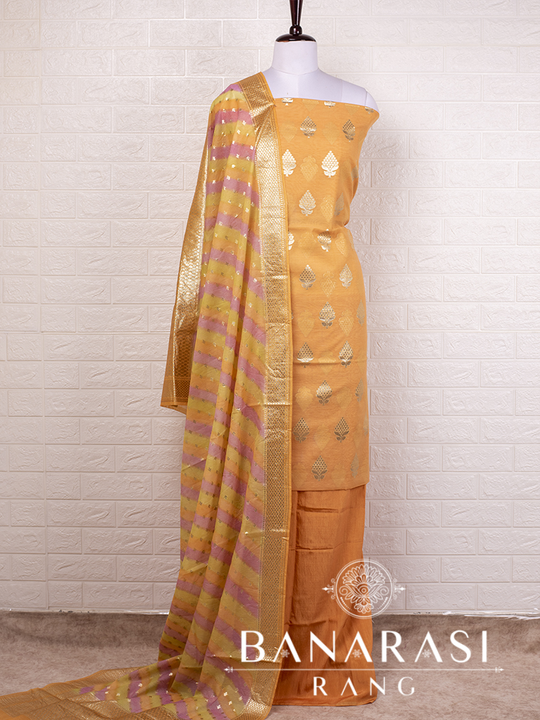 Look dashing in this feminine traditional handwoven exclusive dress material. Includes unstitched fabric of top and bottom,with dupatta.