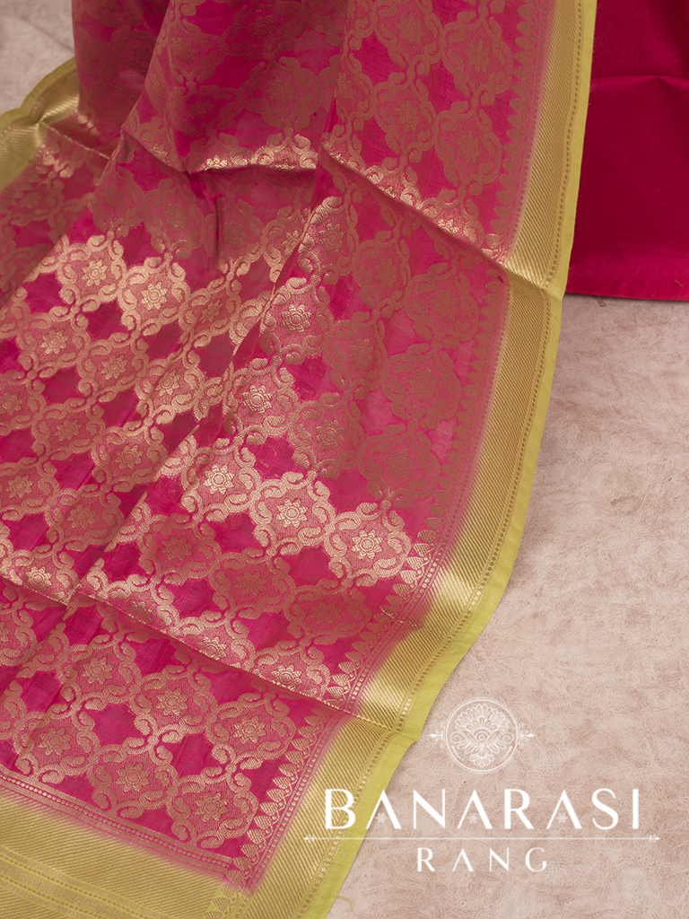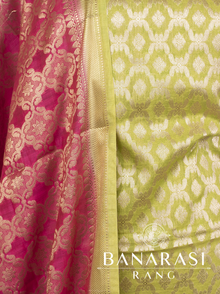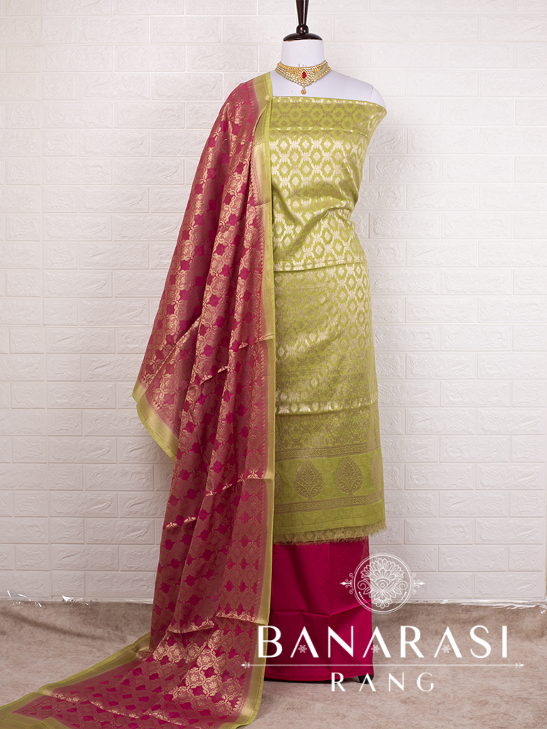 Look dashing in this feminine traditional handwoven exclusive dress material. Includes unstitched fabric of top and bottom,with dupatta.