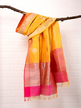 The handloom banarasi katan silk dupatta in vibrant colour and beautifully designed zari all over.Adding to its uniqueness is a beautifully curated contrast border with zari work