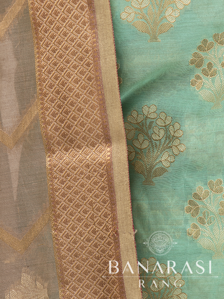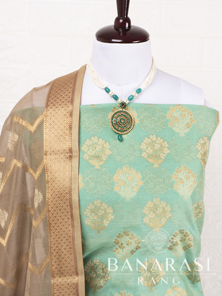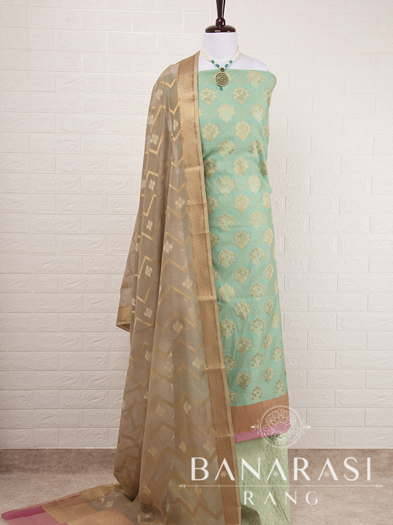 Look dashing in this feminine traditional handwoven exclusive dress material . Includes unstitched fabric of top and bottom,with dupatta. Product - Handwoven Pure chanderi suit colour- Light Green