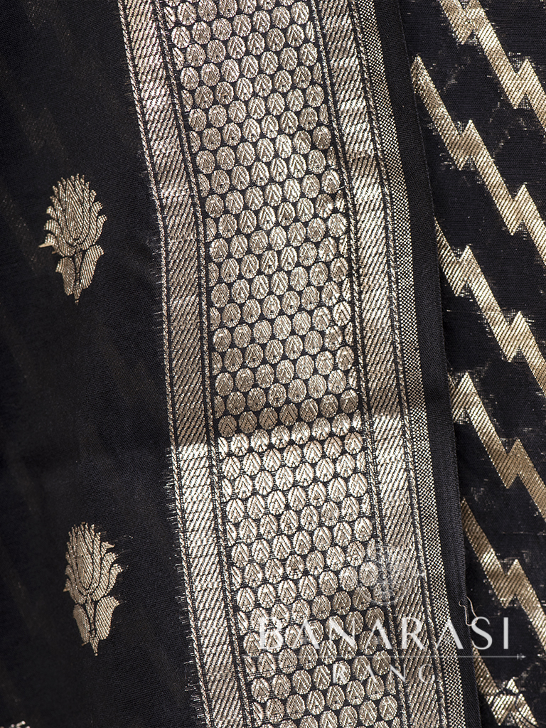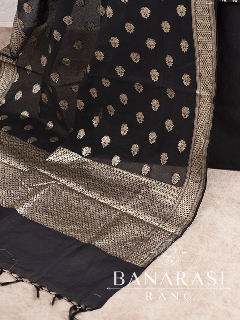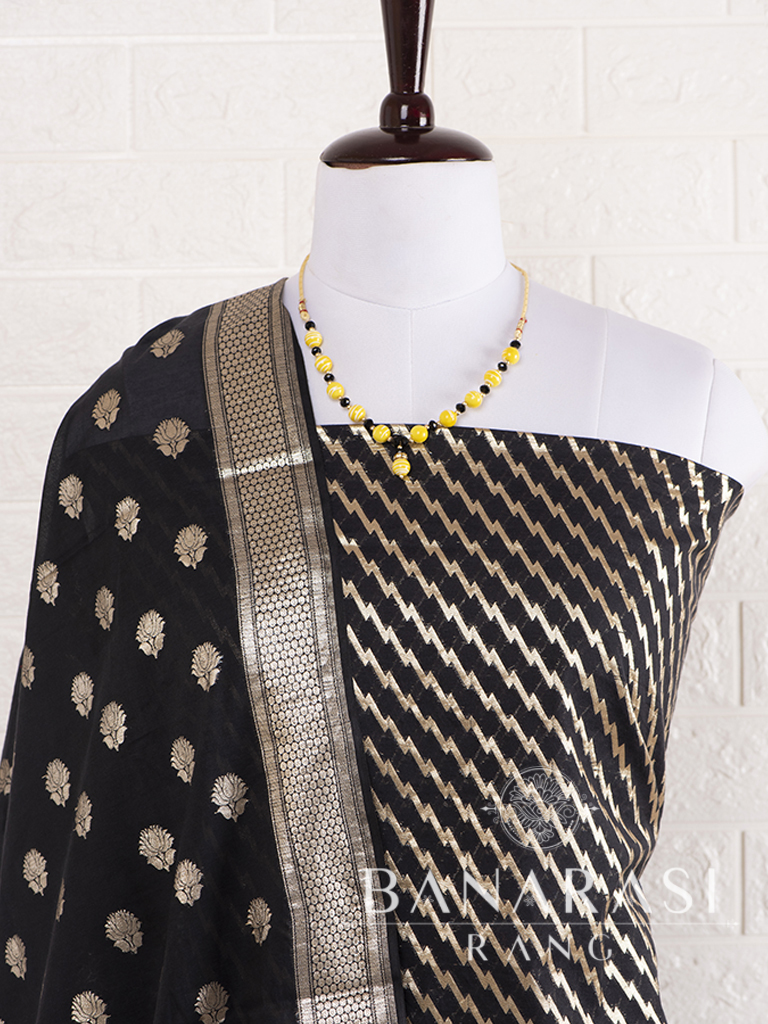 Look dashing in this feminine traditional handwoven exclusive dress material . Includes unstitched fabric of top and bottom,with dupatta. Product - Handwoven Pure chanderi suit colour- Black