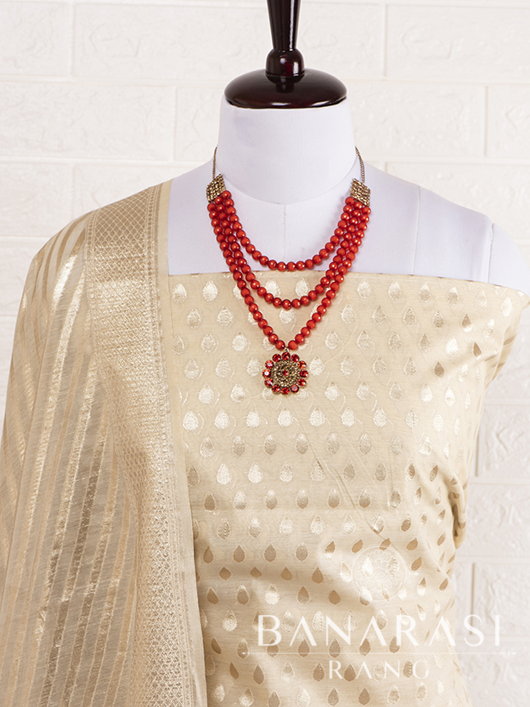 Look dashing in this feminine traditional handwoven exclusive dress material . Includes unstitched fabric of top and bottom,with dupatta. Product - Handwoven Pure chanderi suit Fabric - Chanderi Cotton colour- Cream