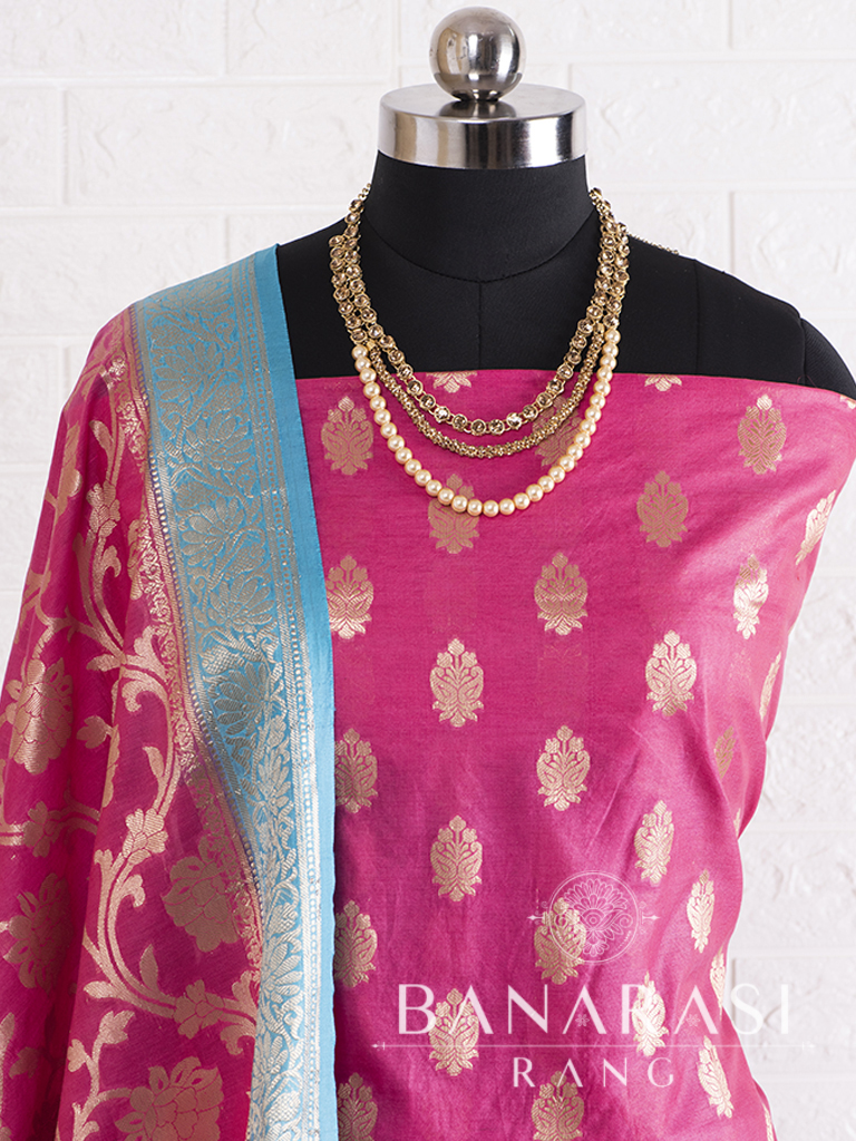 Look dashing in this feminine traditional handwoven exclusive dress material . Includes unstitched fabric of top and bottom,with dupatta. Product - Handwoven Pure chanderi suit Fabric - Chanderi Cotton colour- mauve