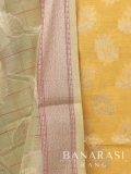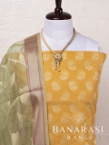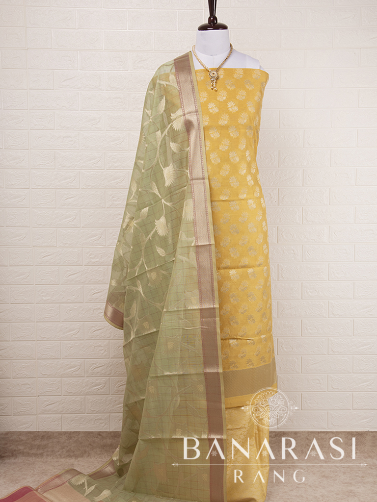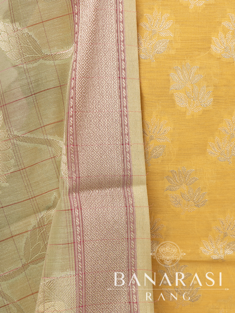 Look dashing in this feminine traditional handwoven exclusive dress material . Includes unstitched fabric of top and bottom,with dupatta. Product - Handwoven Pure chanderi suit colour- Yellow