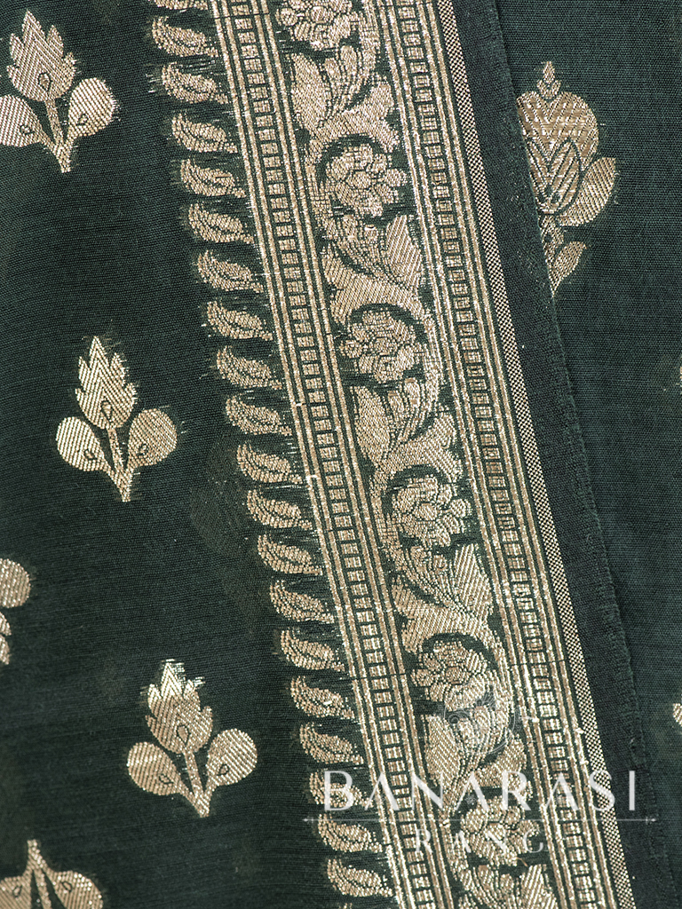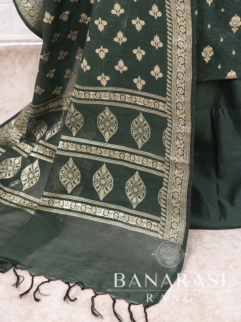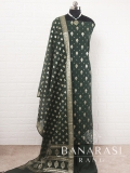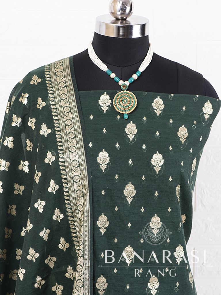 Look dashing in this feminine traditional handwoven exclusive dress material . Includes unstitched fabric of top and bottom,with dupatta. Product - Handwoven Pure chanderi suit colour- Dark Green