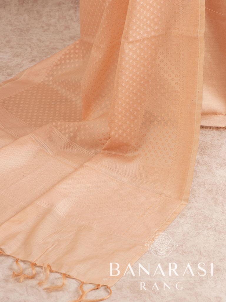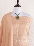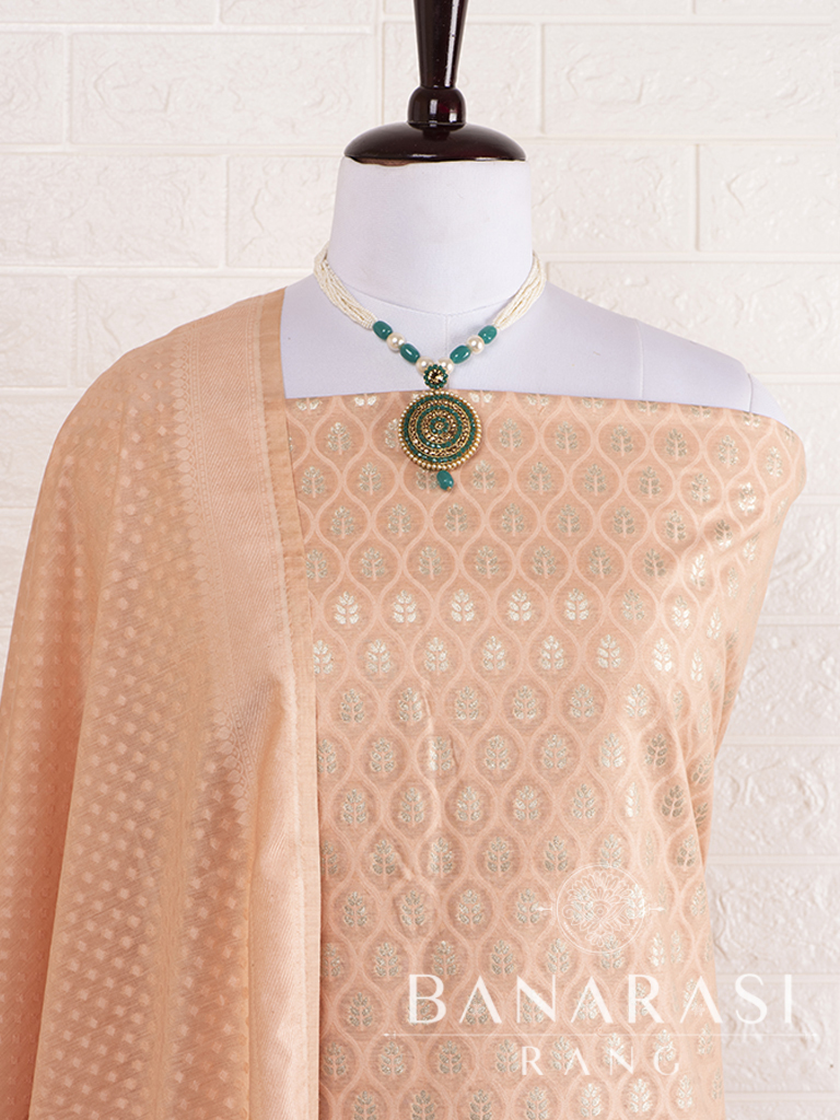 Look dashing in this feminine traditional handwoven exclusive dress material . Includes unstitched fabric of top and bottom,with dupatta. Product - Handwoven Pure chanderi suit Fabric - Chanderi Cotton colour-peach