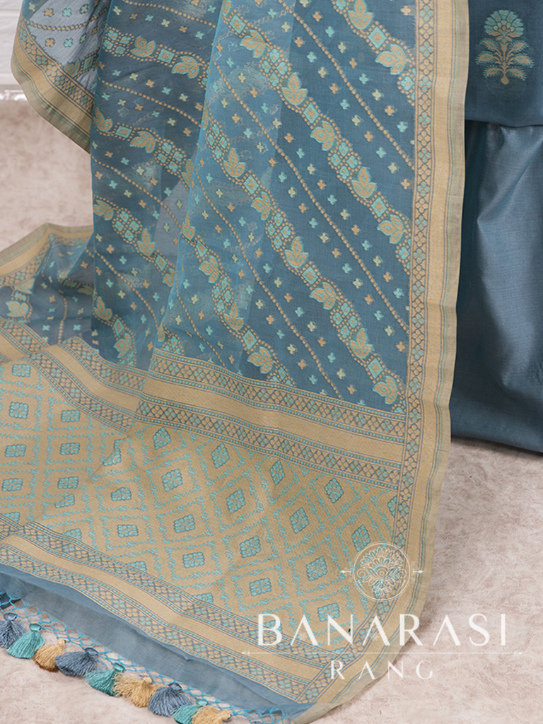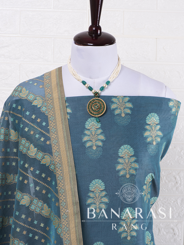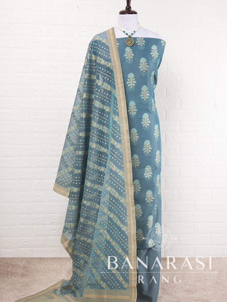 Look dashing in this feminine traditional handwoven exclusive dress material . Includes unstitched fabric of top and bottom,with dupatta. Product - Handwoven Pure chanderi suit colour- Elegant Blue