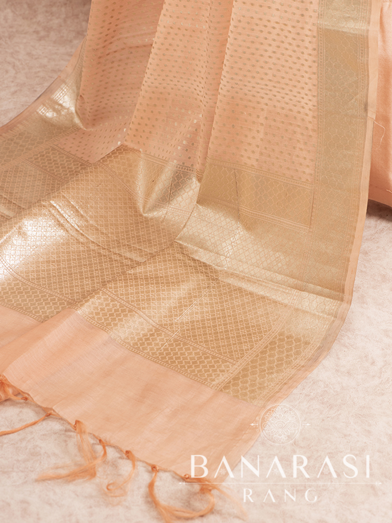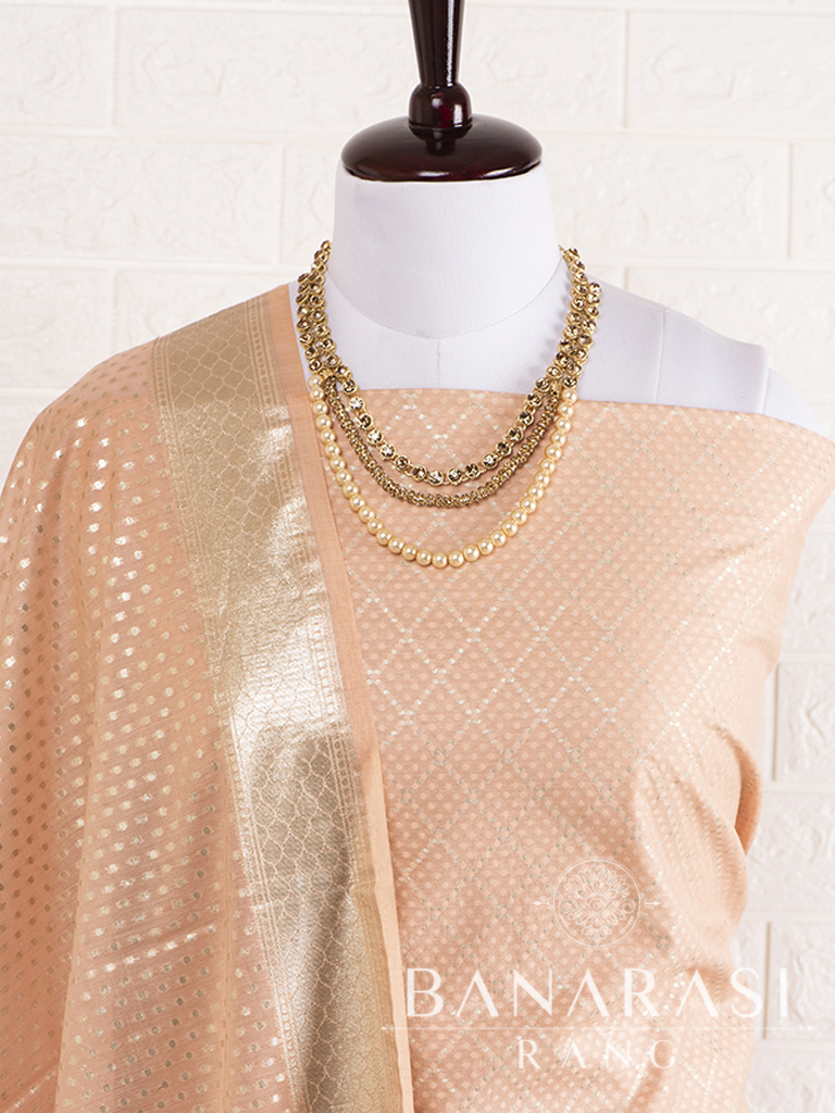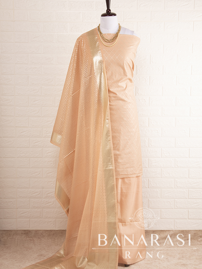 Look dashing in this feminine traditional handwoven exclusive dress material . Includes unstitched fabric of top and bottom,with dupatta. Product - Handwoven Pure chanderi suit Fabric - Chanderi Cotton colour- Peach