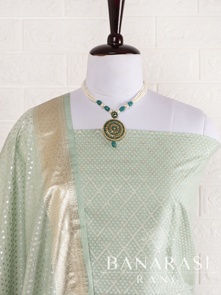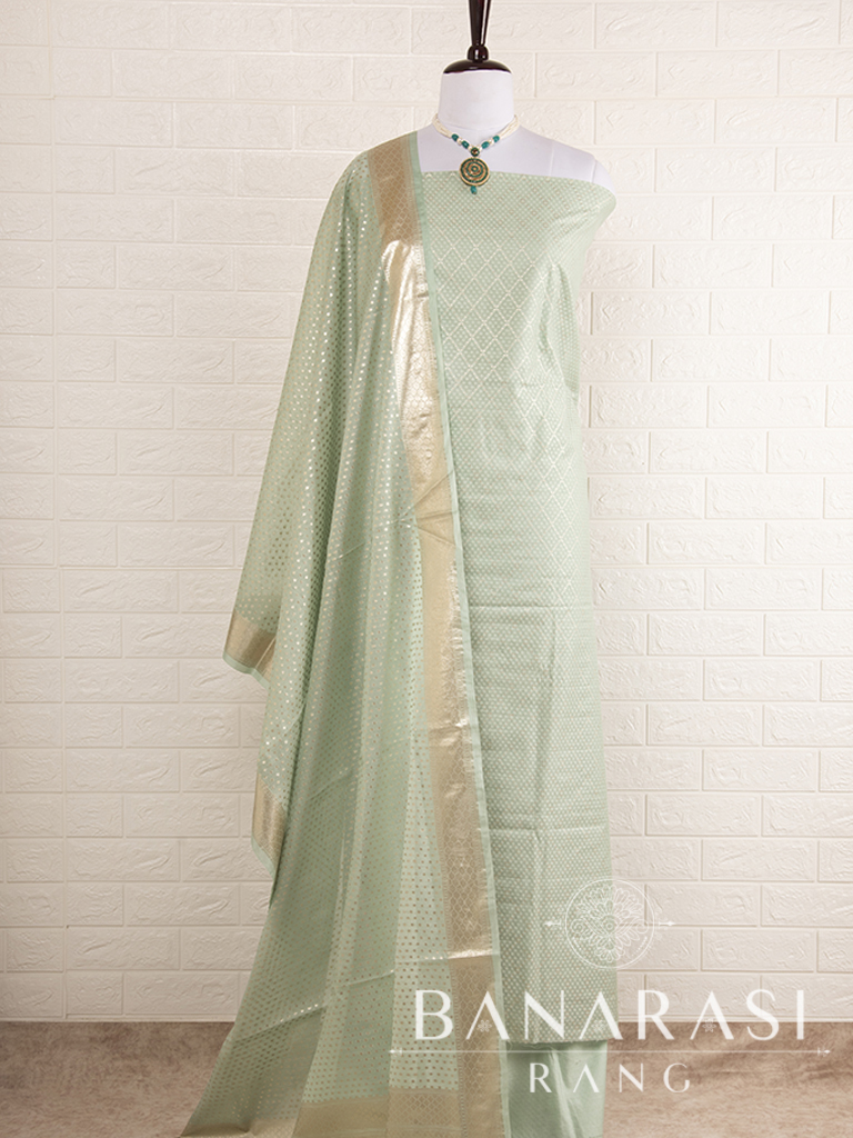 Look dashing in this feminine traditional handwoven exclusive dress material . Includes unstitched fabric of top and bottom,with dupatta. Product - Handwoven Pure chanderi suit Fabric - Chanderi Cotton colour- Green