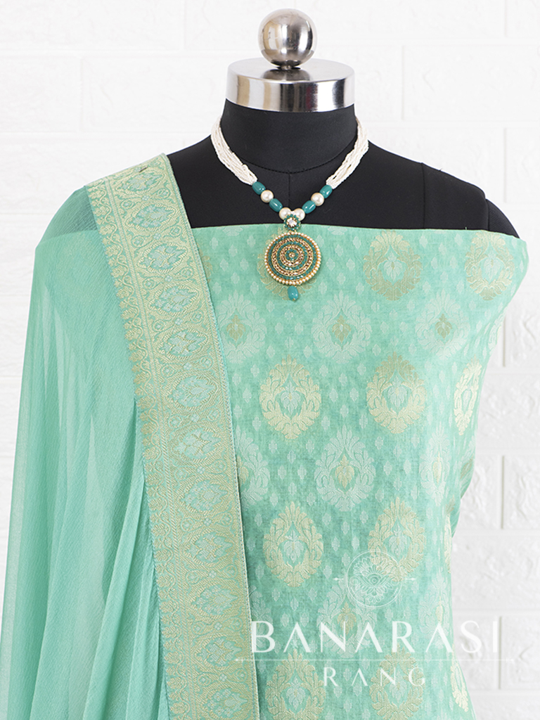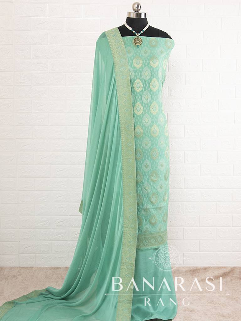 Look dashing in this feminine traditional handwoven exclusive dress material . Includes unstitched fabric of top and bottom,with dupatta. Product - Handwoven Pure chanderi suit