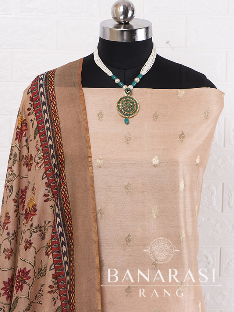 Look dashing in this feminine traditional handwoven exclusive dress material . Includes unstitched fabric of top and bottom,with dupatta. Product - Pure Silk