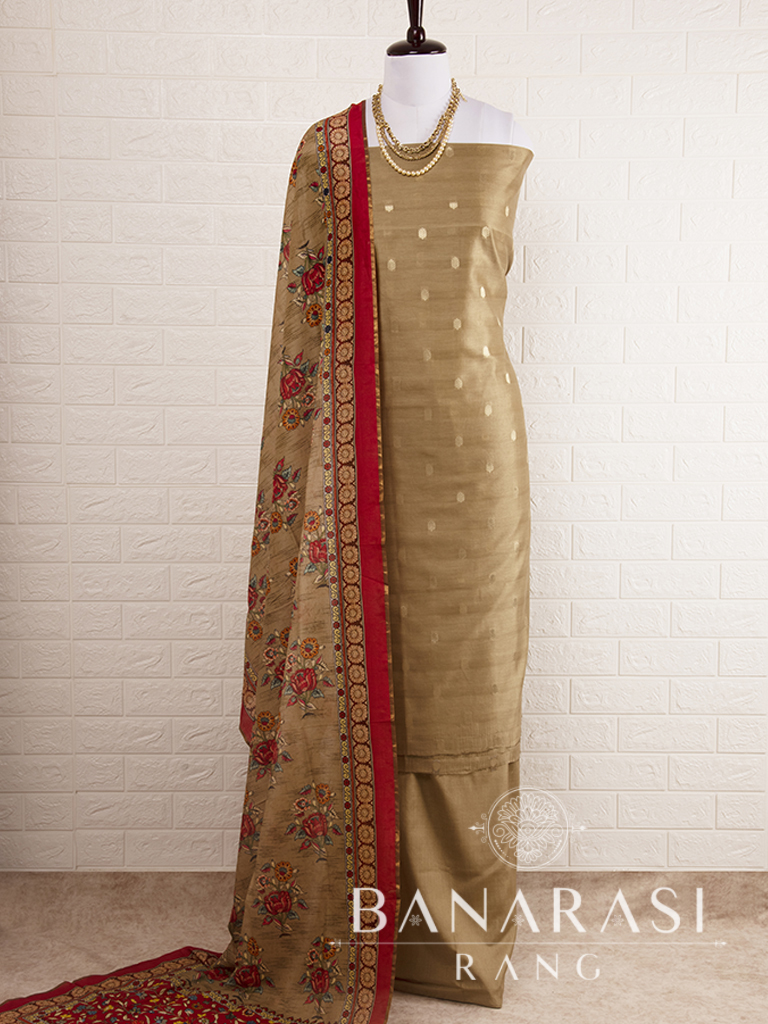 Look dashing in this feminine traditional handwoven exclusive dress material . Includes unstitched fabric of top and bottom,with dupatta. Product - Pure Silk