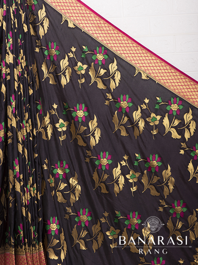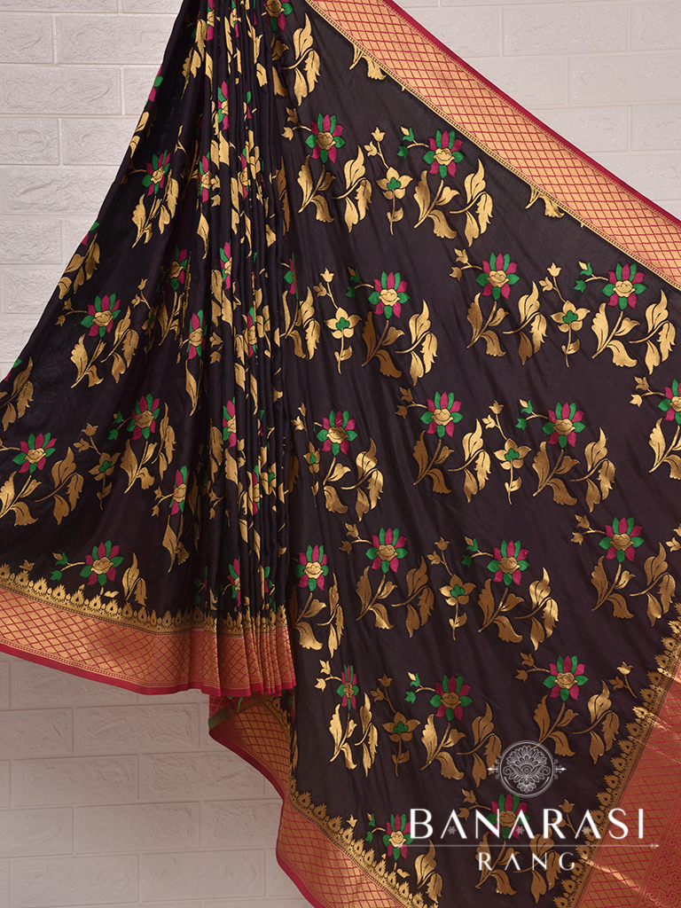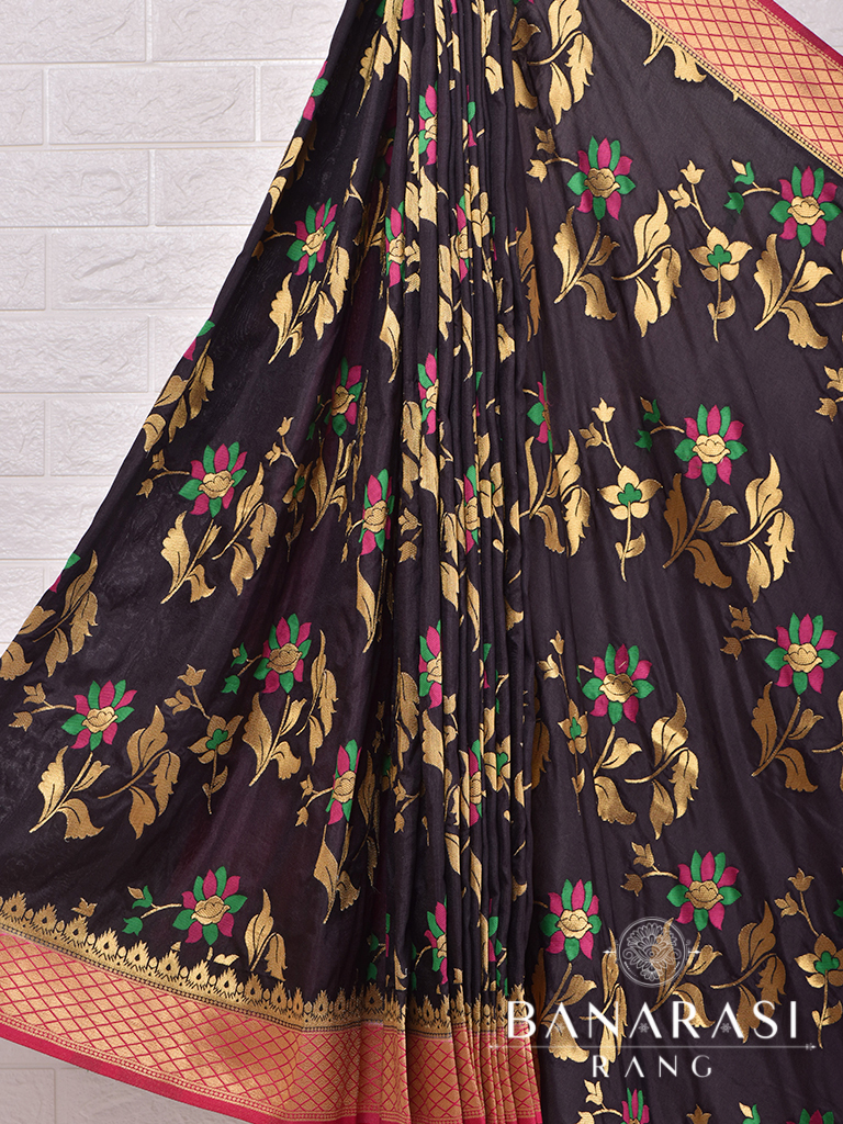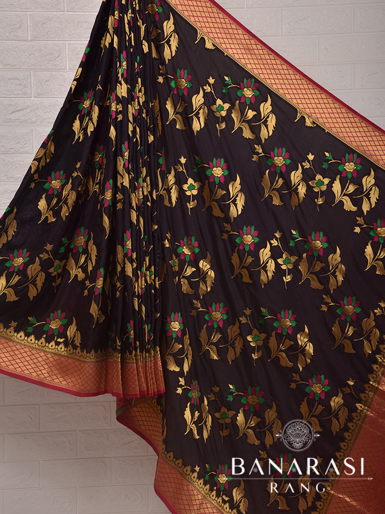 Showcasing Classic craft technique with traditionl design this beautiful semi katan saree in antique colour with zari design and floral border. Pallu of this saree is decorated with zari threads in beautiful pattern. The silk body gives it a ethereal feel.