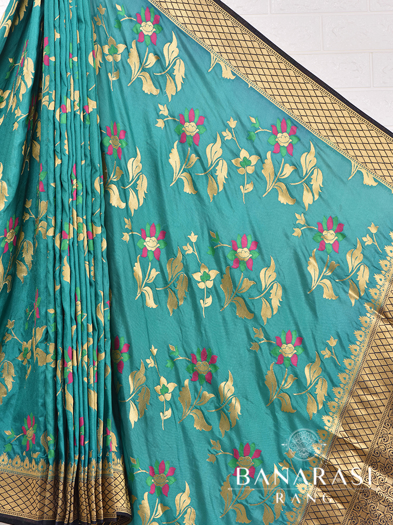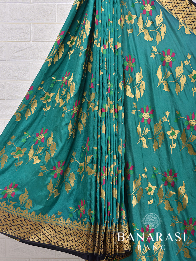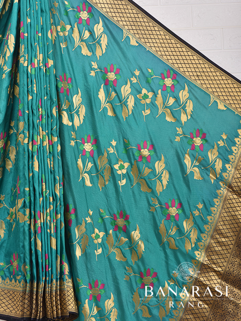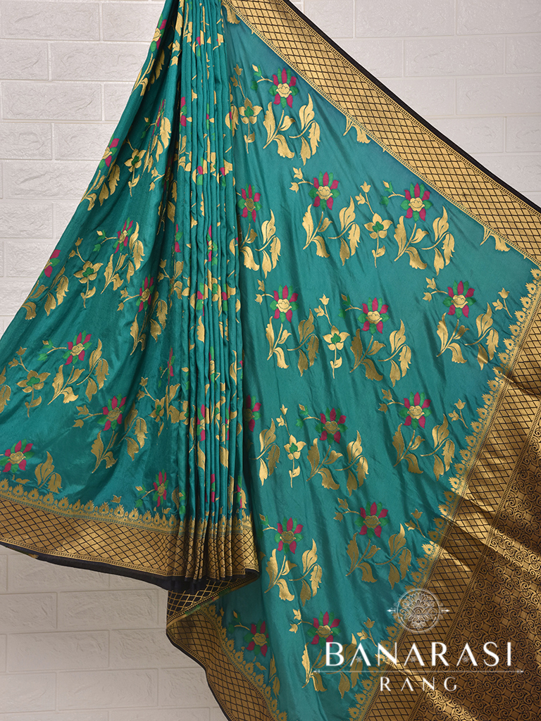 Showcasing Classic craft technique with traditionl design this beautiful semi katan saree in antique colour with zari design and floral border. Pallu of this saree is decorated with zari threads in beautiful pattern. The silk body gives it a ethereal feel.