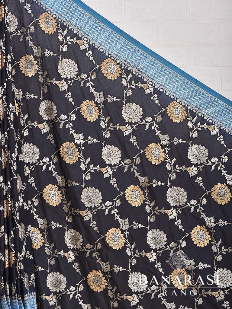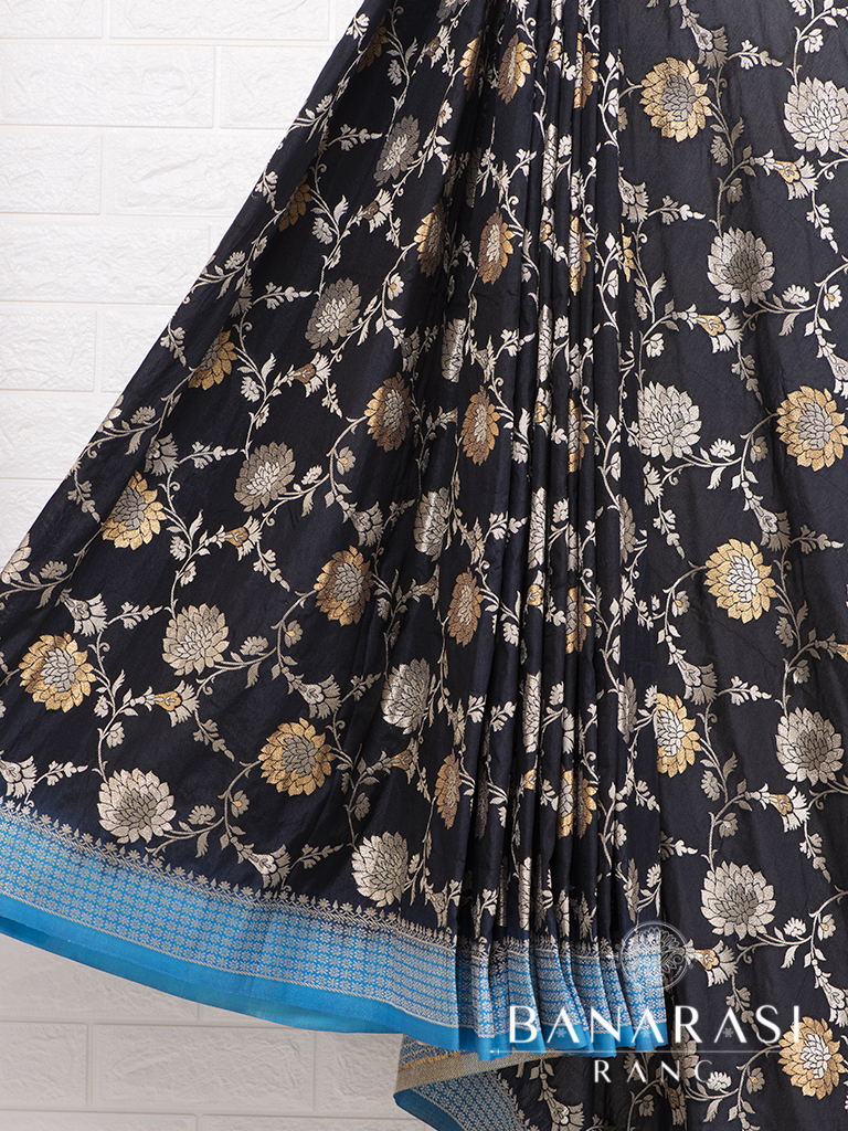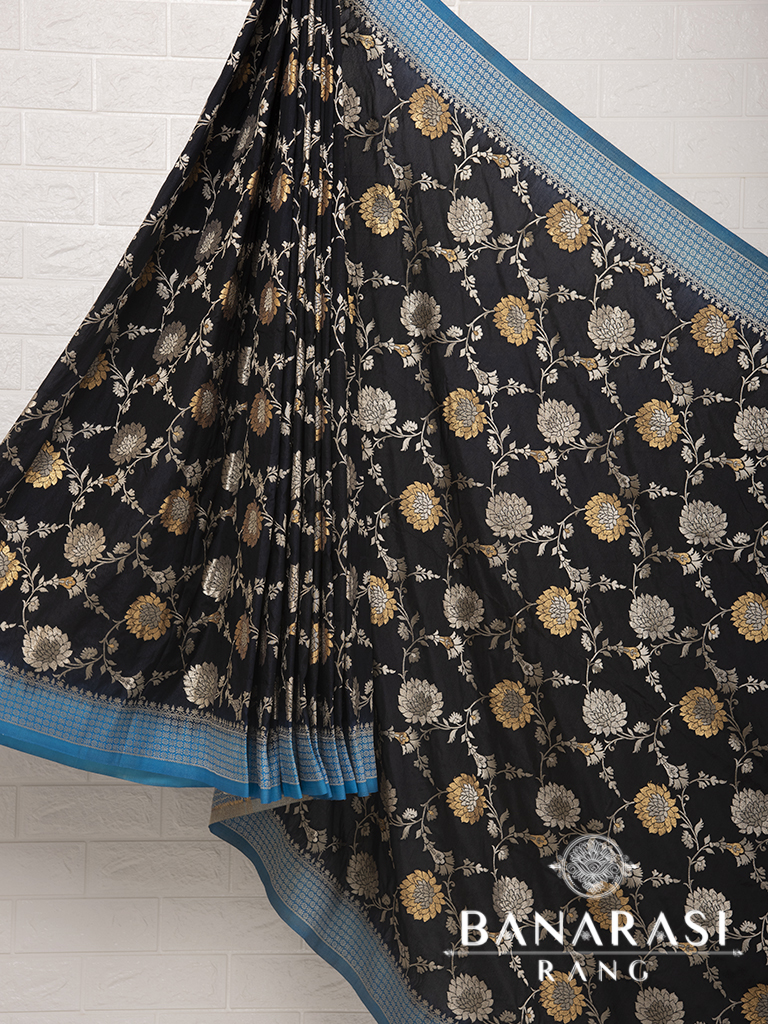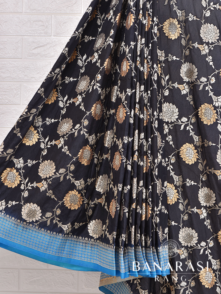 Showcasing Classic craft technique with traditionl design this beautiful semi katan saree in antique colour with zari design and floral border. Pallu of this saree is decorated with zari threads in beautiful pattern. The silk body gives it a ethereal feel.