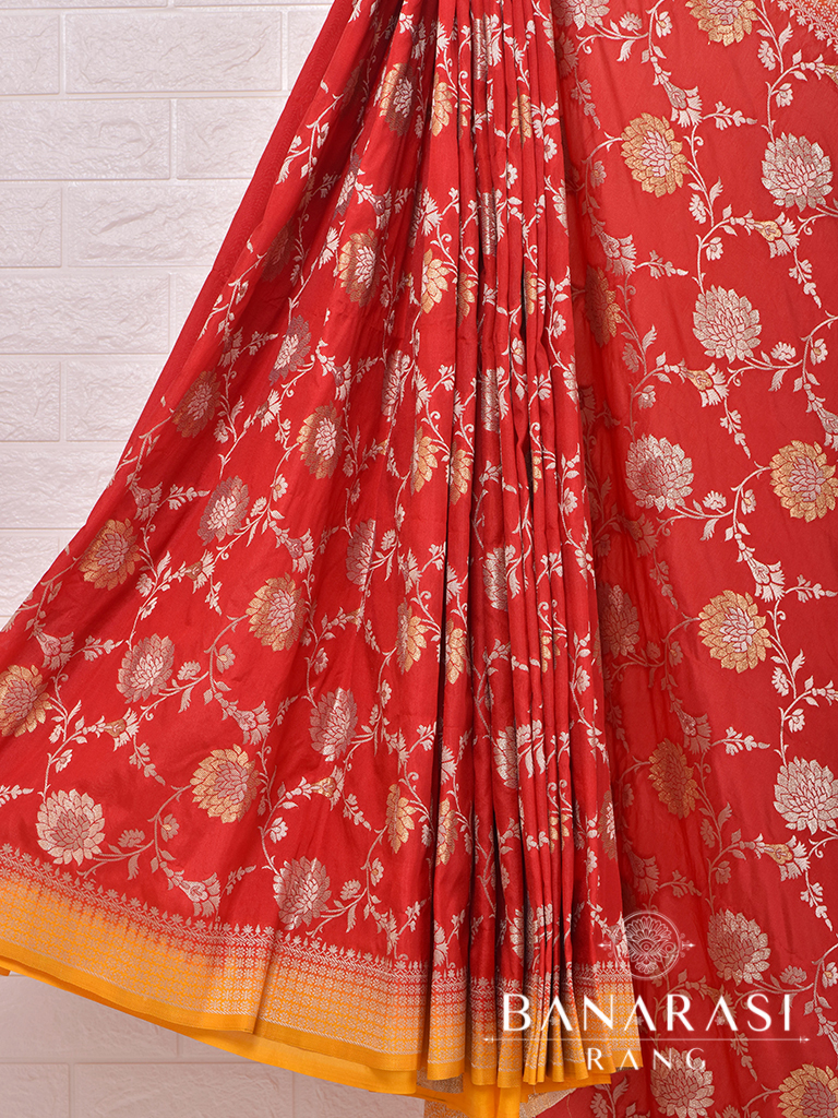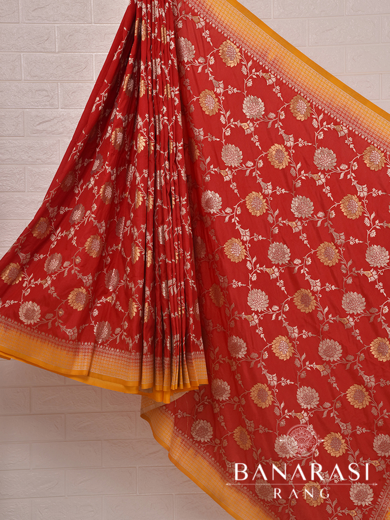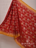 Showcasing Classic craft technique with traditionl design this beautiful semi katan saree in antique colour with zari design and floral border. Pallu of this saree is decorated with zari threads in beautiful pattern. The silk body gives it a ethereal feel.
