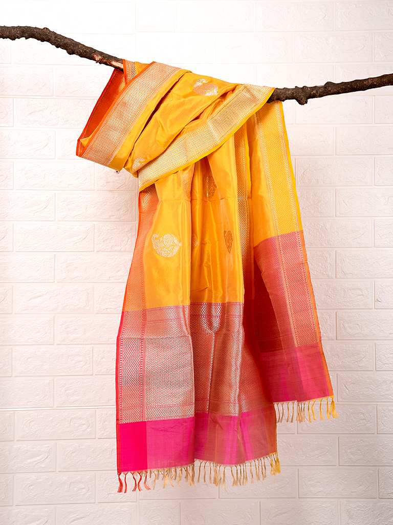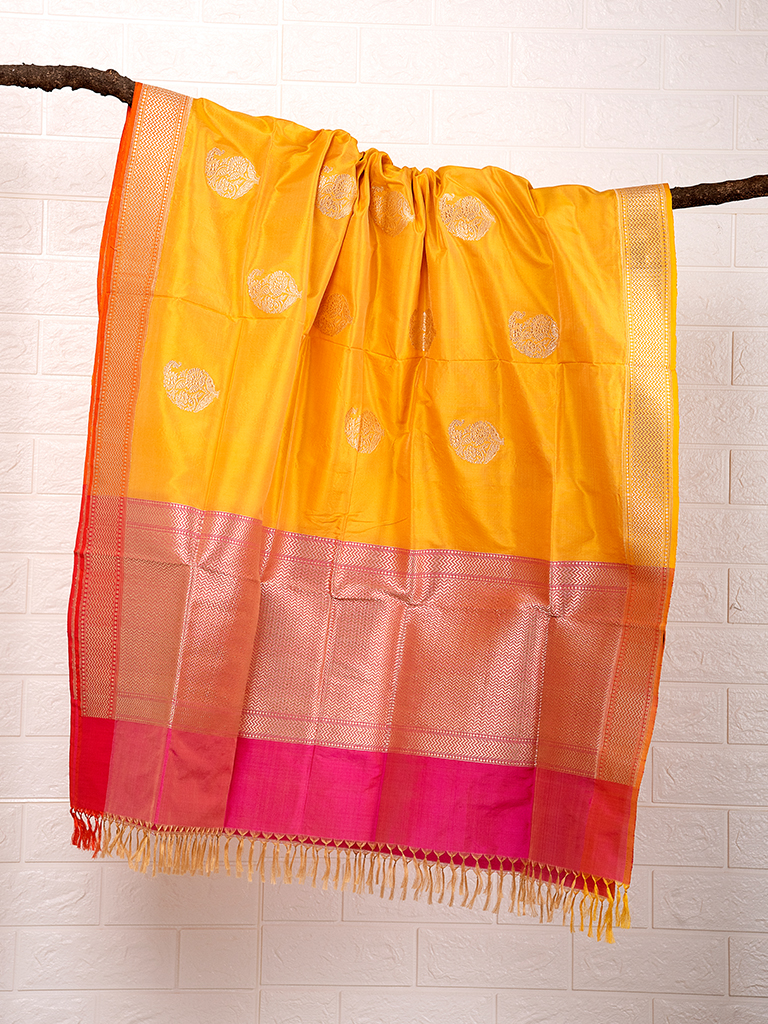The handloom banarasi katan silk dupatta in vibrant colour and beautifully designed zari all over.Adding to its uniqueness is a beautifully curated contrast border with zari work